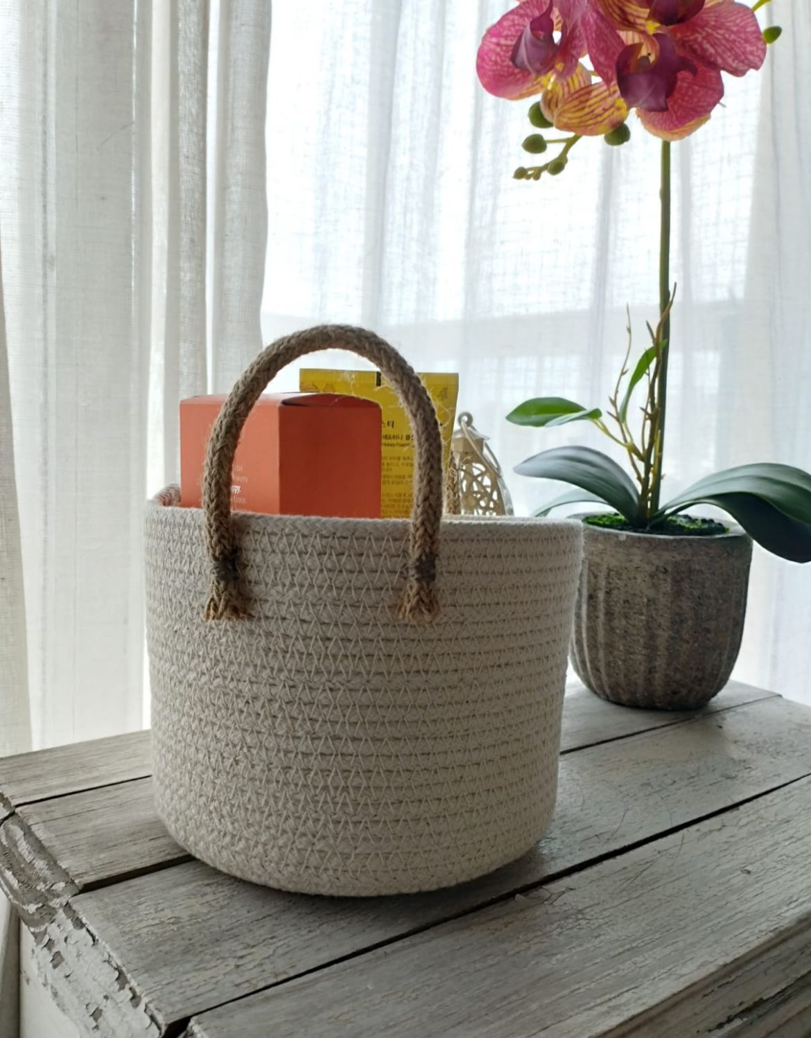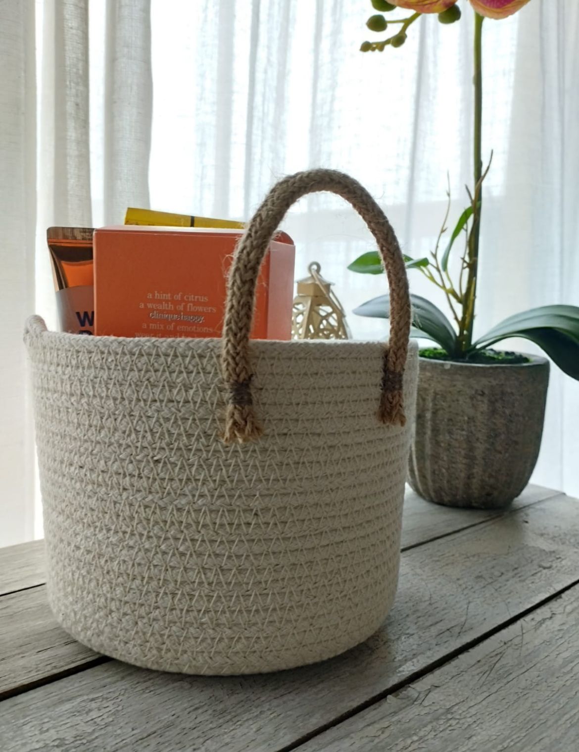 Canasto de algodon de 16 cm de diametro x 12 de alto con agarraderas de yute