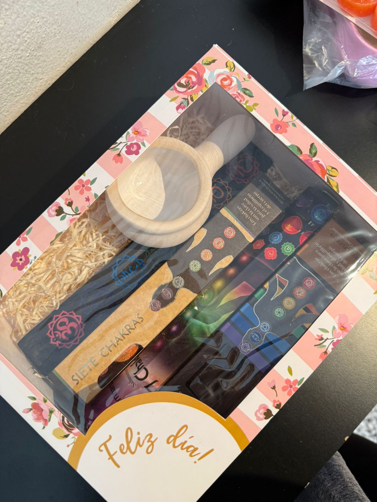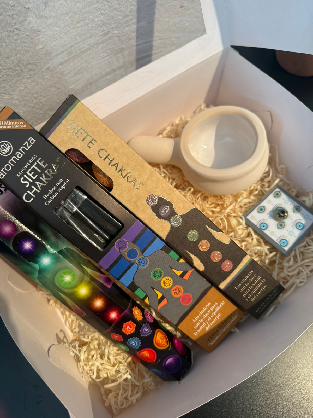 La box contiene: 1 sahumerio 7 chakras, 1 caja esferas 7 chakras, 1 sahumerio 7 chakras iluminarte, un porta sah vidrio y un sahumador esmaltado.