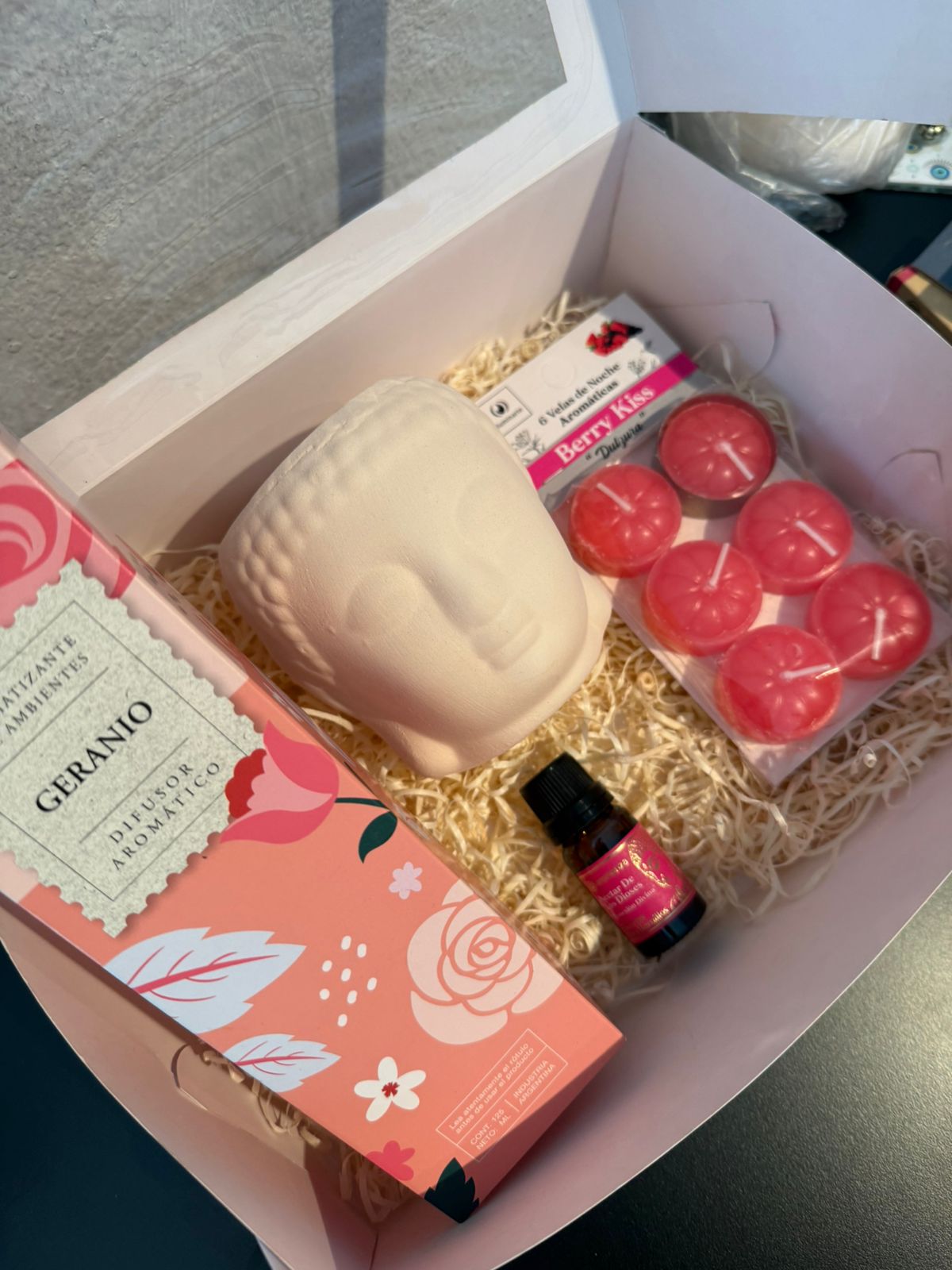 La box contiene: hornillo cabeza de buda, velas aromatizadas, difusor tao y esencia concentrada iluminarte.